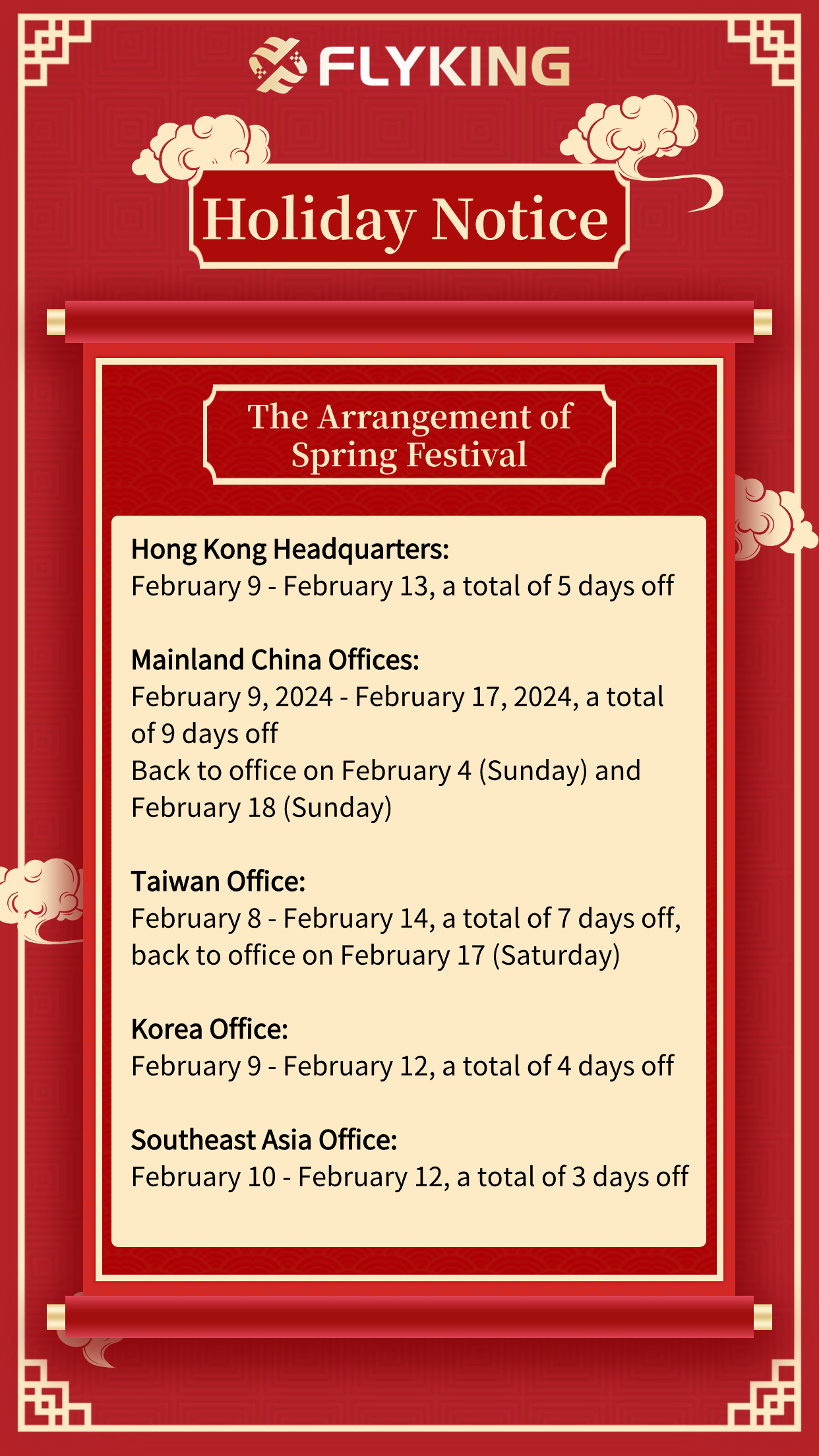 Below are the holiday close times and return to work times of Flyking offices. Please check.